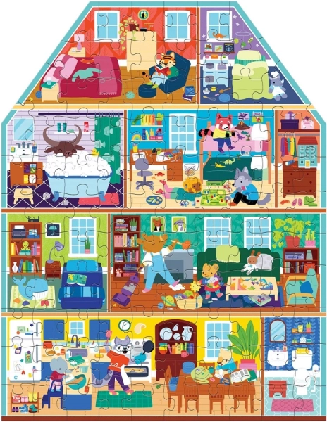 Puzzle Moj Dom Moj Dom donose sate zabave uz šarene ilustracije kućnih scena. Oblik kuće daje cijelim puzzlama jedinstven dojam i čini ih idealnim poklonom za djecu. Izrađene su s visokim udjelom recikliranog papira i tiskane netoksičnim bojama. Zahvaljujući mat završnoj obradi, prikaz detalja i boja je vjeran i jasan.
