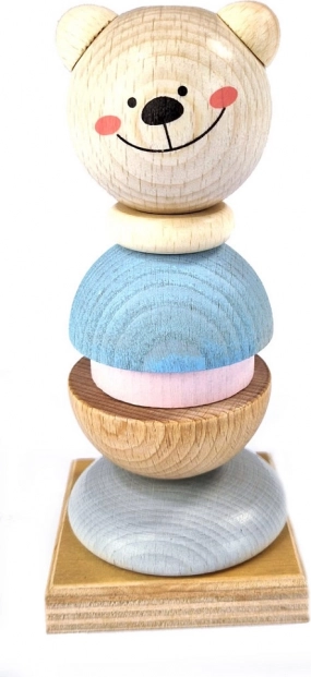 Ovaj drveni naslagujući (stapajući) toranj s motivom medvjedića izvrstan je izbor za prve didaktičke igre. Djeca vježbaju razlikovanje boja i veličina te prirodno razvijaju finu motoriku, preciznost pokreta i koordinaciju oko–ruka. Dijelovi su oblikovani za sigurno i lako držanje malom ručicom.