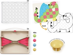 Fantacolor Junior Play Eco+ je pametna edukativna mozaika koja potiče djecu na kreativnost i strpljenje. Zahvaljujući prozirnoj perforiranoj ploči djeca lako umeću velike, okrugle čepiće u otvore te prema ilustriranim karticama slažu simpatične motive životinja i predmeta.