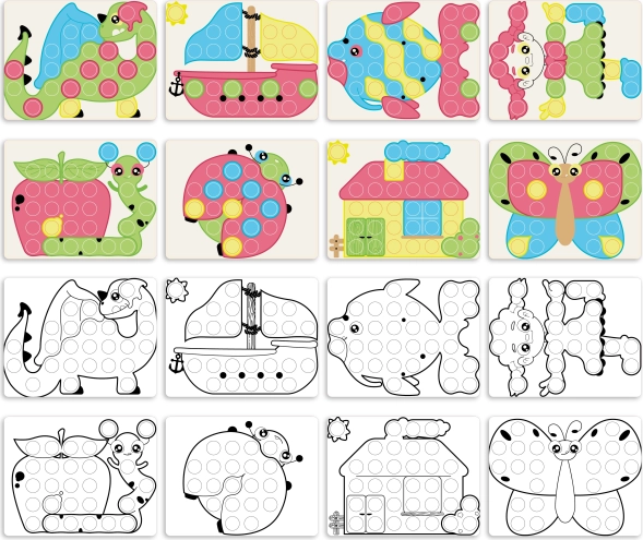 Sadrži 8 ilustriranih kartica s jednostavnim i zabavnim motivima koje razvijaju kreativnost i vizualnu percepciju.