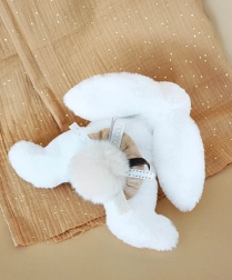 Preslatki plišani zeko u poklon setu iznimno je mekan i svestran – poslužit će kao prijatelj, jastučić i moderna dekoracija dječje sobice. Zahvaljujući vrhunskim materijalima, nježnom plišu i umirujućim bojama idealan je za bebe od rođenja. Elegantni bež pompon i marama daju igrački moderan izgled, a poklon kutija od njega čini savršeni dar.