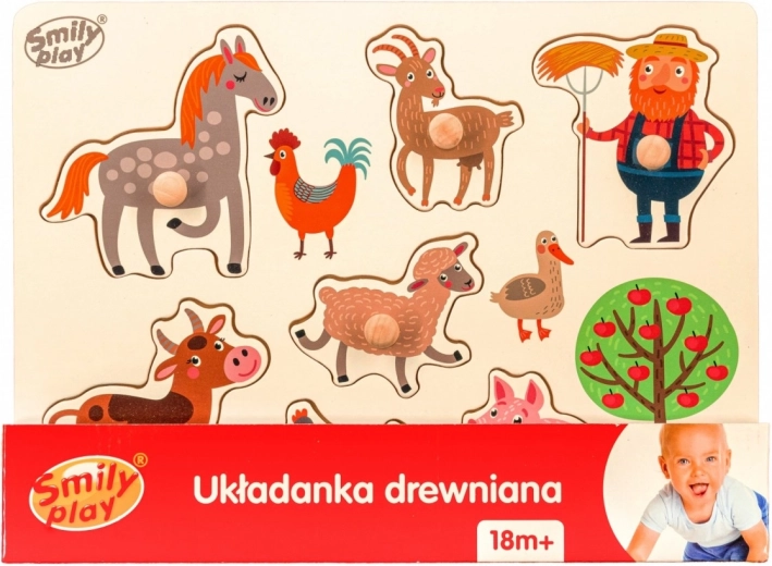 Ova kvalitetna drvena slagalica s umetanjima sadrži ploču i šest zasebnih dijelova s motivima životinja s farme. Svaki dio ima ergonomsku ručkicu radi lakšeg rukovanja te odgovara svom oblikovanom mjestu. Igranje na zabavan način razvija koordinaciju oko–ruka, finu motoriku i vizualno pamćenje.