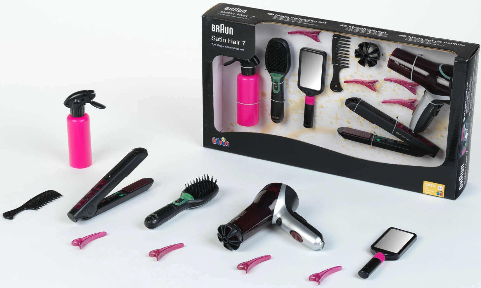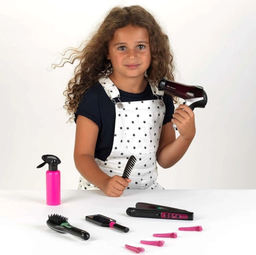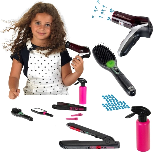 Kompletan dječji frizerski set brenda KLEIN donosi realističnu salonsku zabavu kod kuće. Sadrži BRAUN sušilo, peglu za kosu i ionsku četku na baterije s svjetlosnim i zvučnim efektima, dopunjene ogledalcetom, češljem, raspršivačem, nastavkom za sušilo i 4 svjetlucave ukosnice. Idealno za igru frizerskog salona i razvoj kreativnosti djece od 3 godine.