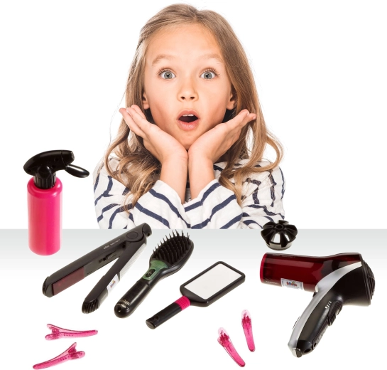 Sušilo, pegla i četka na baterije stvaraju atraktivne efekte koji djeci približavaju prave frizerske alate – sigurno i bez topline.