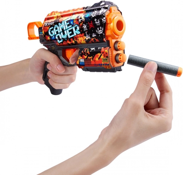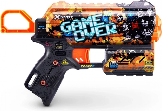 Unesite stil videoigara u bitke s pištoljem X-Shot Skins Flux u motivu Game Over. Zahvaljujući najsuvremenijoj tehnologiji tiska blaster izgleda iznimno atraktivno, dok ergonomski oblici i lagana konstrukcija osiguravaju udobno rukovanje i pri duljoj igri.