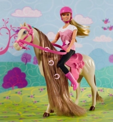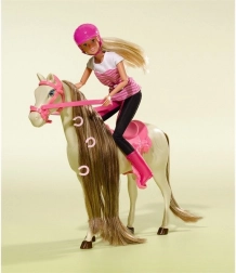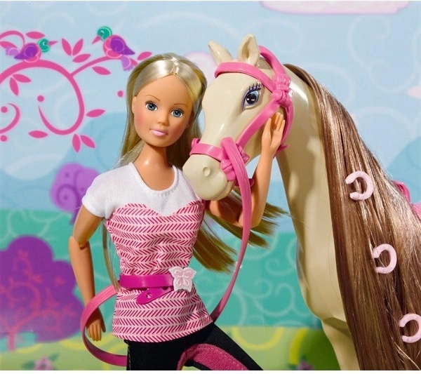 Steffi sa svojim konjem u jahaćoj odjeći. Konj ima vrlo dugu grivu koju se može češljati i uređivati.