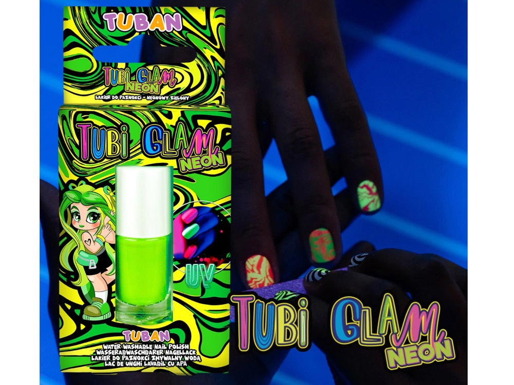 Novost u obliku neonskih lakova za nokte TUBI GLAM ljetna je ponuda brenda TUBAN namijenjena mladim damama koje prate aktualne trendove. Lakovi TUBI GLAM NEON oduševljavaju intenzivnim, neonskim bojama koje svijetle pod UV svjetlom – žutom, ružičastom i zelenom.