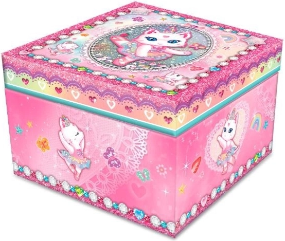 Očaravajuća glazbena kutija s motivom mačke balerine oduševit će djecu i odrasle. Nakon otvaranja figurica se zavrti i zasvira klasična melodija. Kutija ima ogledalce i prostor za sitnice, radi zahvaljujući mehaničkom navijanju i ne zahtijeva baterije.