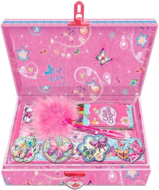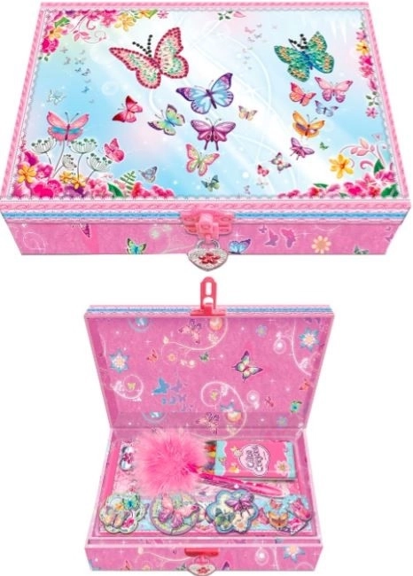 Pecoware set s dnevnikom s motivom leptira pakiran je u ukrasnoj kutiji i zatvara se malim lokotom, što je idealno za sigurno čuvanje vaših tajni.