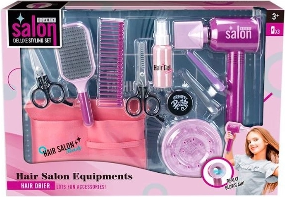 Set je namijenjen djeci od 3 godine naviše te im pomaže razvijati kreativnost i fine motoričke vještine. Sušilo za kosu radi na baterije i zahtijeva 3xAAA baterije (nisu uključene u pakiranje).