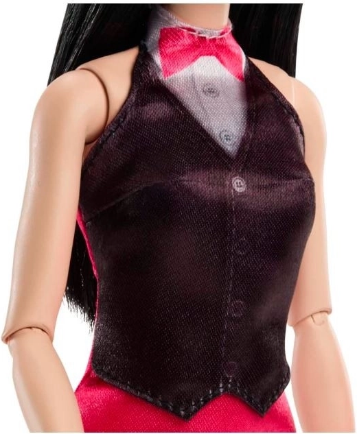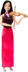 Talentirana Barbie violinistica sada na sceni! Očaravajuća modna lutka spremna je pokazati svoje glazbene vještine s violinom i gudalom, odjevena u elegantnu haljinu s crnim prslukom. Mali glazbenici mogu uz pomoć pomičnih zglobova u ramenima i laktovima pomoći Barbie da zasvira violinu.