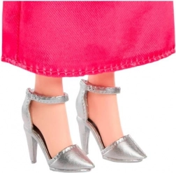 Elegantna haljina i crni prsluk daju lutki svečani izgled, dok srebrne cipele upotpunjuju stil.