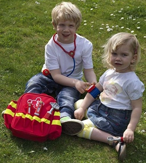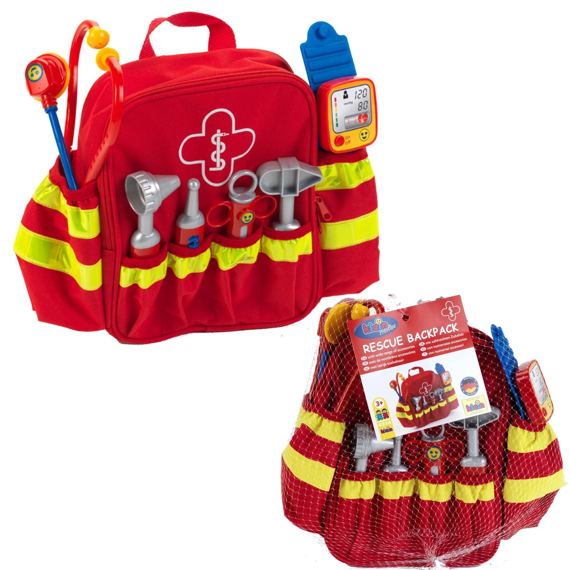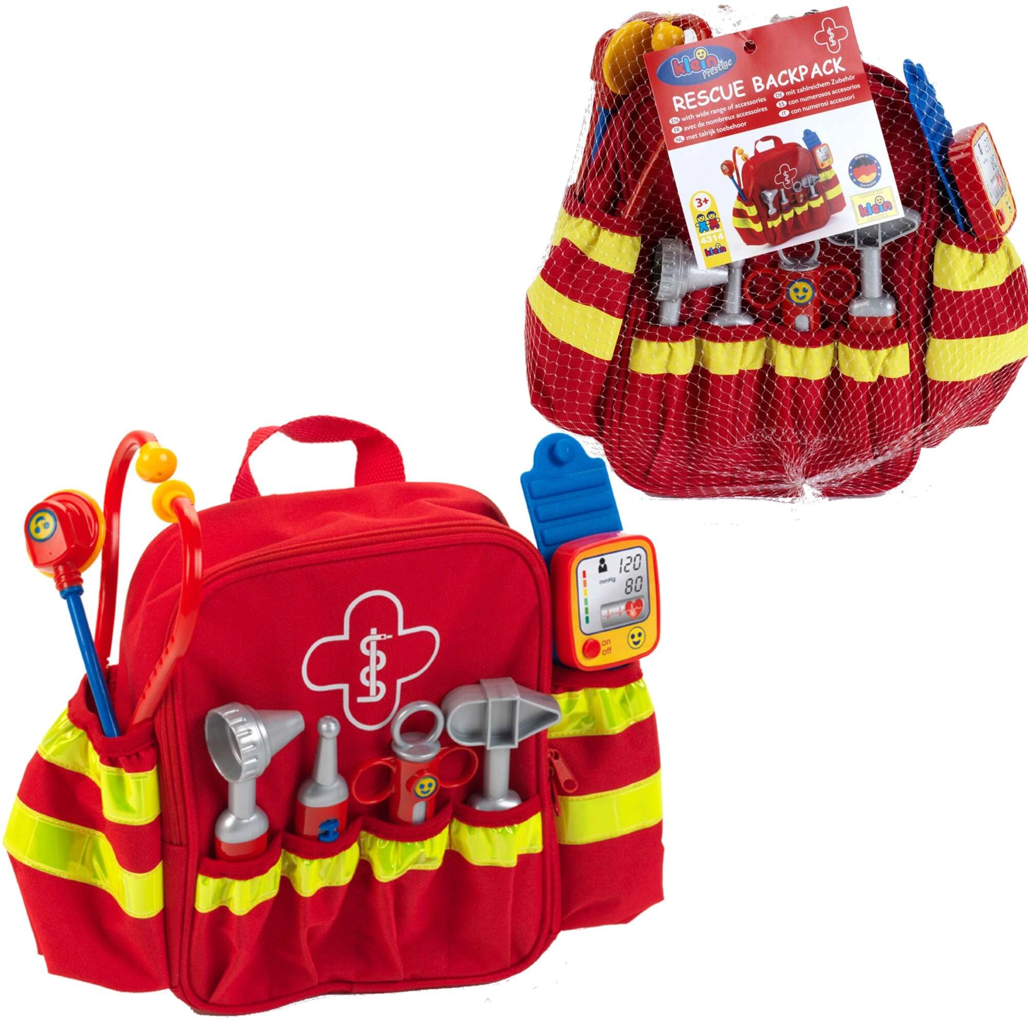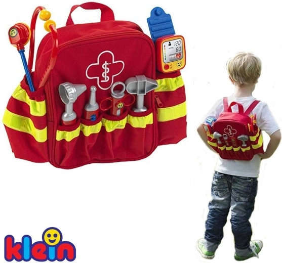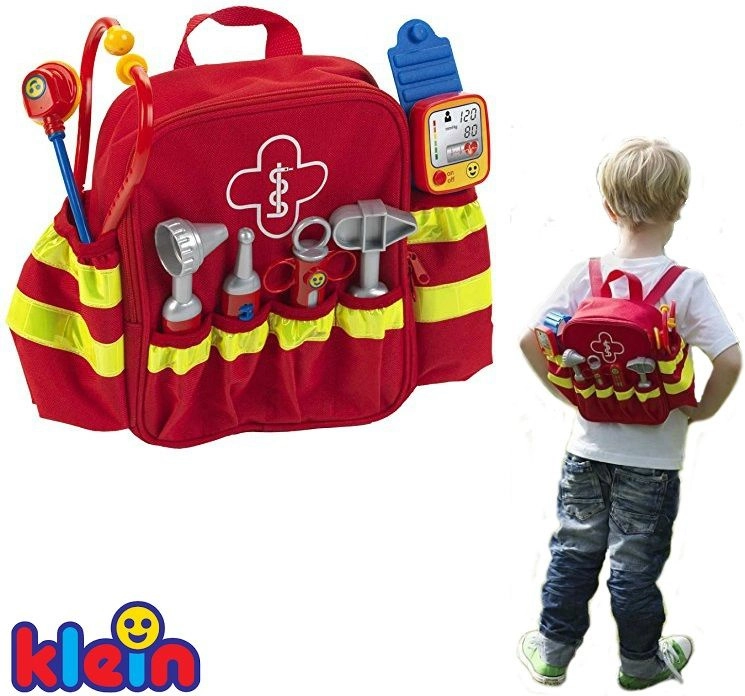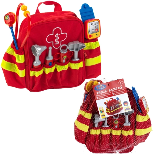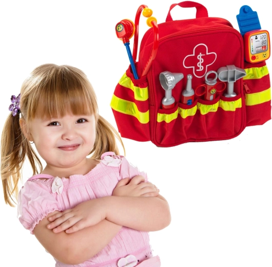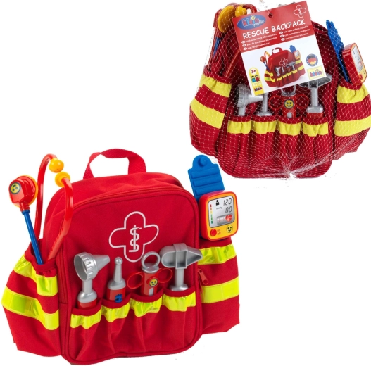 Dio seta je šest klasičnih “ordinacijskih” pomagala: stetoskop za slušanje srčeka, otoskop za uši, toplomjer, refleksno čekić, štrcaljka i tlakomjer. Kvalitetna izrada i glatki rubovi osiguravaju da je igra sigurna za djecu od 3 godine. Zahvaljujući podesivim naramenicama ruksak udobno pristaje većini predškolaca.