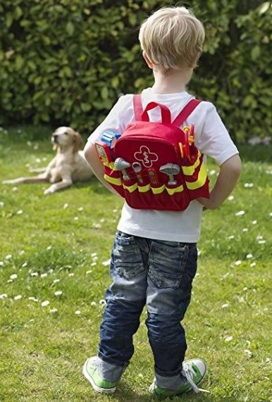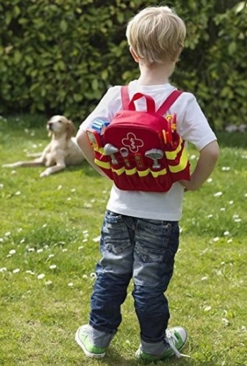 Crveni ruksak s bijelim križem i reflektirajućim žutim prugama dobro je vidljiv i siguran pri igri na otvorenom. Praktični džepovi drže alate pri ruci, a patentni zatvarač sve sigurno zatvara.