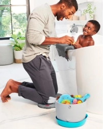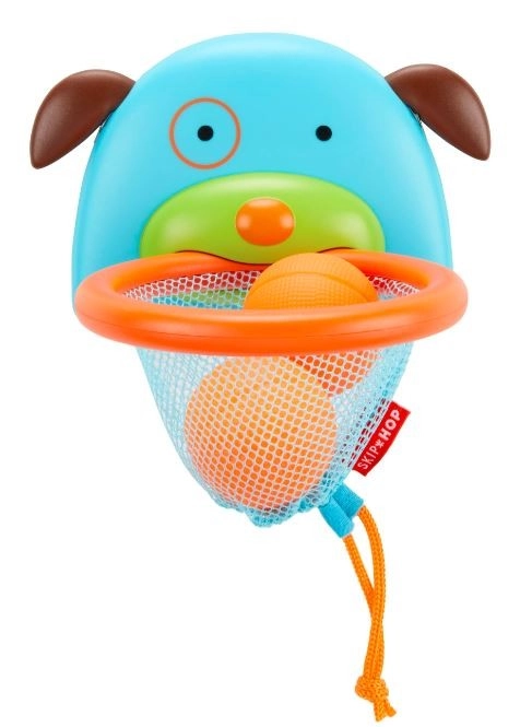 Mrežica s čvrstom ručkom, dvije kantice i koš za loptice pretvaraju kupku u aktivnu igru koja razvija koordinaciju ruka–oko.