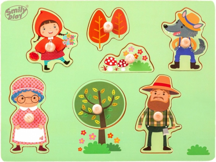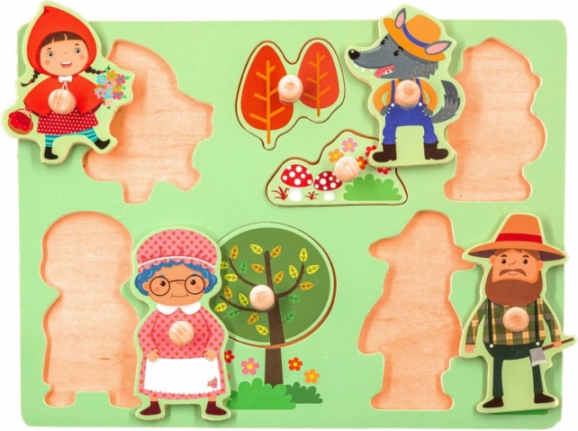 Svaki dio ploče ima drugačiji oblik i boju – puzzle predstavljaju različite likove iz bajke o Crvenkapici.