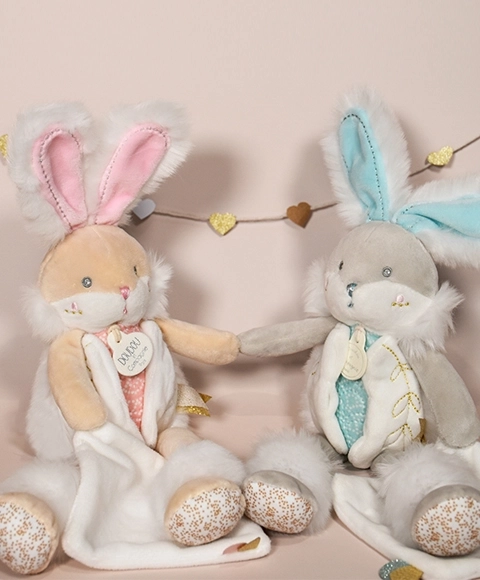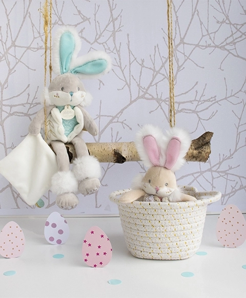 Mekana poklon-set za bebe: plišani zeko s dekicom duljine 31 cm u elegantnoj kutiji. Baršunasto mekan pliš, premium materijali i sigurnost prema CE normama osiguravaju udobnost i razvoj osjetila od prvih dana.
