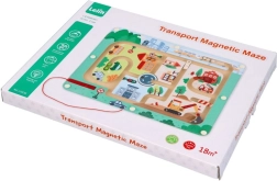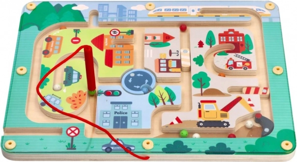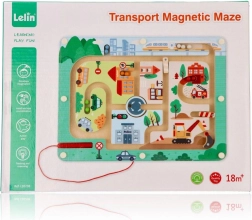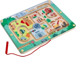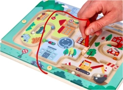 Otkrijte zabavni svijet s Magnetičnim labirintom Vozila, dizajniranim da stimulira razmišljanje i vještine malih ruku. Ova igračka je izrađena od kvalitetnog drva i prikazuje živopisnu scenu grada s cestama, zgradama i vozilima. Pomoću crvene magnetske palice djeca vode male kuglice po trasi, što podržava njihove manualne vještine i koordinaciju ruka-oko.