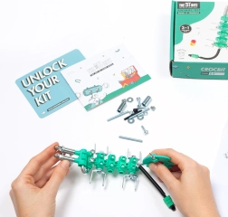 U pakiranju se nalazi sve potrebno, uključujući specijalni alat. Dijelove možete slobodno kombinirati i nadopunjavati uobičajenim predmetima iz kućanstva – mašti nema granica. Uz CrocBit djeca otkrivaju principe konstrukcije i mehanike kroz igru.