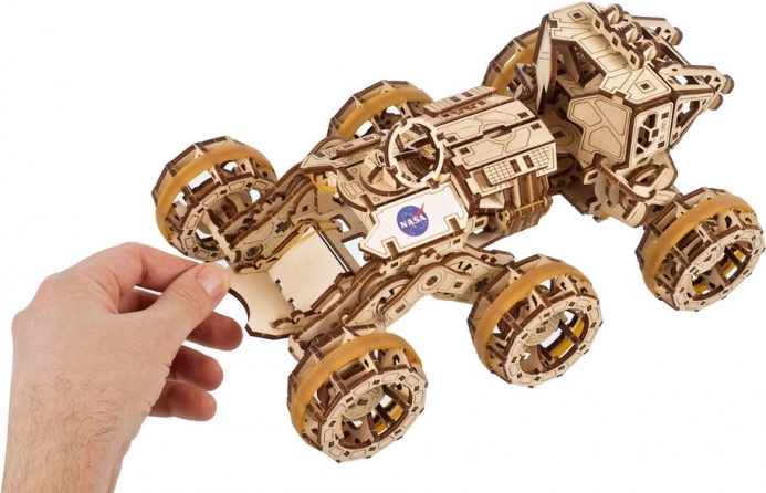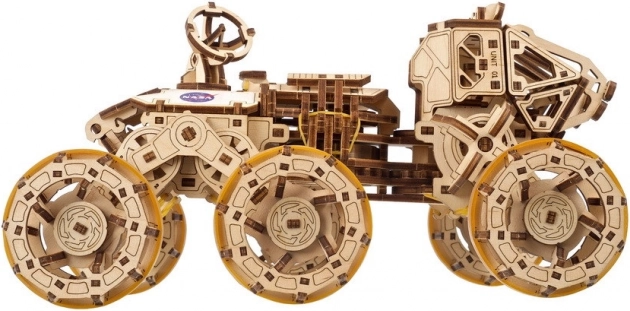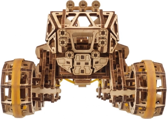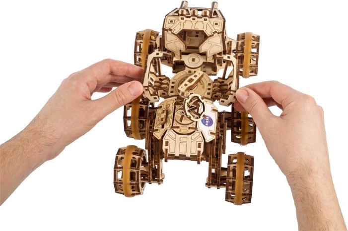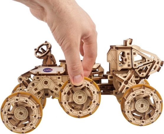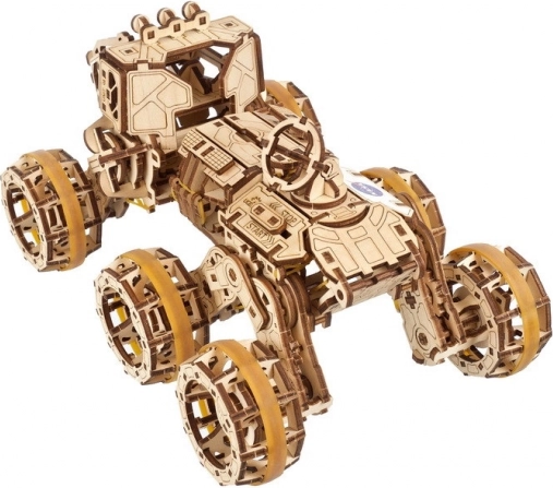 Ovaj detaljni mehanički model marsovskog rovera ističe se pametnom konstrukcijom s pogonom na svih šest kotača (6x6), oprugnim motorom i potpuno neovisnim ovjesom. Kabina za dva „astronauta“, zglobna veza s karoserijom za bolju stabilnost, upravljačka prednja kola i preklopna stražnja rampа pružaju realističan doživljaj iznimno sposobnog terenskog istraživača. Upravljanje je jednostavno zahvaljujući kliznom prekidaču Start/Stop i čegrtaljkastom ključu za navijanje motora.