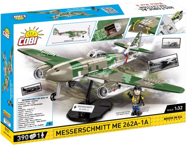 COBI donosi uvjerljivo izrađen model legendarnog njemačkog mlaznog lovca MESSERSCHMITT Me 262 A-1a, prvog borbenog zrakoplova s mlaznim pogonom u operativnoj uporabi. Kamuflaža i oznake temelje se na muzejskom primjerku u Deutsches Museumu u Münchenu. Figurica pilota inspirirana je Hansom Guidom Mutkeom.
