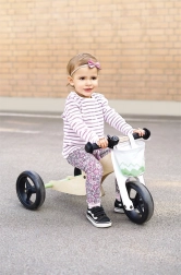 Pametno rješenje 2u1 za prve vožnje: ovaj drveni tricikl u trenu se pretvara u balans-bicikl. Zahvaljujući podesivoj visini sjedala (24–34 cm) i 3 položaja pomaka sjedala raste s djetetom od 12 mjeseci. Za sigurnost tu su ograničivač zakreta upravljača, meke EVA gume, gumene ručke, zvono i odvojiva torbica. Kompaktne dimenzije 64 × 42 × 37 cm i nosivost 50 kg jamče puno zabave u kući i na otvorenom.