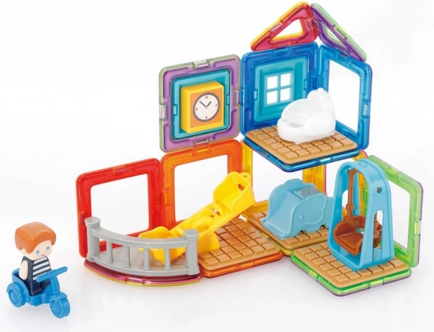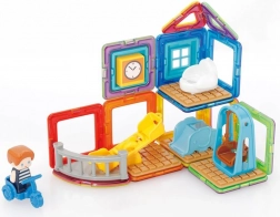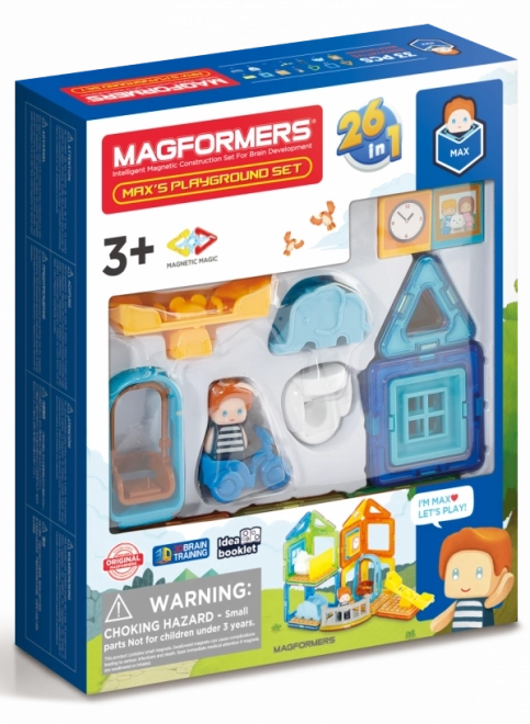 Uživajte u zabavi s Maxom i njegovim igralištem. Kreativna magnetska konstrukcijska igračka omogućuje sastavljanje velikog broja trodimenzionalnih objekata pomoću dvodimenzionalnih plastičnih mnogokuta. Magformers vježba finu motoriku, potiče kreativnost, uči djecu bojama i osnovnim geometrijskim oblicima. Dimenzije dijelova i prikladno odabrani oblici osiguravaju maksimalnu moguću sigurnost igračke. Materijal od kojeg je izrađena konstrukcijska igračka zadovoljava najstrože higijenske i zdravstvene kriterije. Dijelovi su dovoljno veliki, ne mogu se progutati i praktički su neuništivi. Pakiranje sadrži: