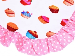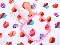 Pregača i dodaci s raznobojnim motivom cupcakea i ružičastim volanima štite odjeću i daju kuhanju zabavan stil.