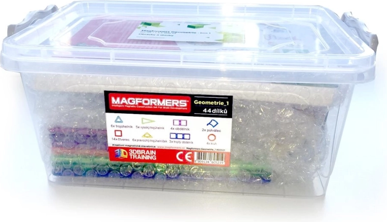 Kutija 1 namijenjena je dječjim vrtićima te 1. i 2. razredu osnovne škole. Set Magformers Geometrija Box 1 - Sličice i građevine sadrži pregledne edukativne kartice i sve potrebne dijelove za ispunjavanje zadataka s kartica. Radne kartice prate sadržaj važećih školskih kurikuluma, a korištena terminologija prilagođena je njihovoj razini. Magformers Geometrija namijenjena je razvoju matematičke predpismenosti u predškolskom odgoju i za poučavanje geometrije u nižim razredima osnovne škole. Može se koristiti i u okviru inkluzije te u obrazovanju djece stranaca. Pakiranje sadrži 44 dijela: