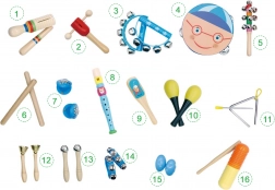 - Grebalica (2×), drvene ritmijske palice (2×), kastanjete (2×), marakase (2×), triangl, tamburin, frula, zvončići, janissary/činele – različite izvedbe (više komada), traka za glavu sa zvončićima