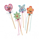 Izradite do četiri različita štapića i svaki ukrasite po želji – uz pomoć šarenih traka i prenosivih sličica. Rezultat su originalni dodaci za igre vila, princeza i čarobnjaka.