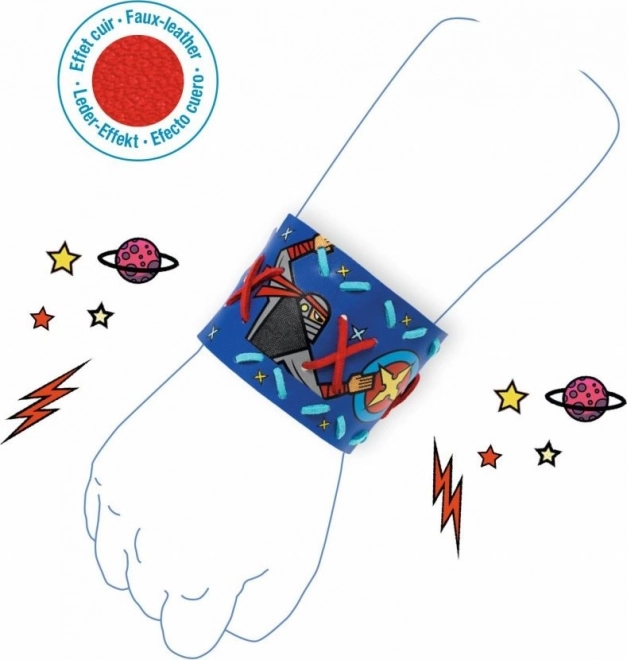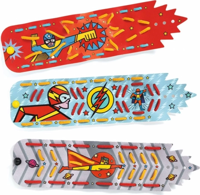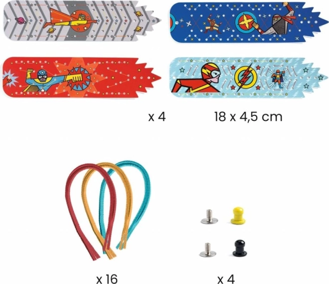 Uz ovaj DJECO kreativni set djeca mogu osmisliti i izraditi do četiri stilizirane narukvice sa superjunačkom temom. Zahvaljujući predizbušenim dijelovima izrada je intuitivna i zabavna – dovoljno je provući vezice prema oznakama na narukvicama i pratiti priložene upute. Ugodno nošenje osiguravaju mekane baršunaste (semiš) vezice i elementi od sintetičke kože.