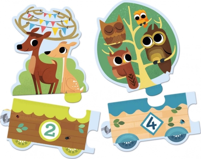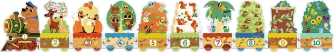 Ove konturirane puzzle brenda DJECO pretvaraju učenje u radosnu vožnju. Lokomotiva i devet vagona čine šareni vlak u kojem se vozi različit broj životinja – djeca tako prirodno povezuju brojeve s količinama i vježbaju percepciju množine.
