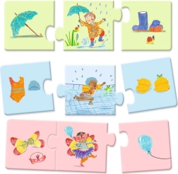 Otkrijte zabavne edukativne puzzle Djeco, u kojima djeca slažu trojke koje prikazuju tijek jednoga dana. Zahvaljujući velikim i čvrstim dijelovima debljine oko 3 mm, puzzle se lako slažu, potiču finu motoriku, koordinaciju oko–ruka, logičko razmišljanje i razvijaju maštu kroz pripovijedanje priča.