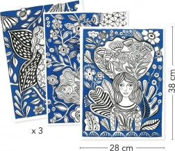 Set sadrži 3 umjetnička motiva dimenzija otprilike 28 × 38 cm, spremna postati originalna dekoracija nakon bojanja.