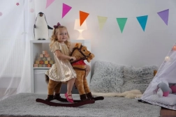 Preslatki ljuljački konjić od mekane plišane tkanine razveselit će svakog malog jahača. Pritiskom na ušesa proizvodi zvukove – rzanje i kas – a zahvaljujući drvenim ljuljačkim letvama, sedlu i stremenima nudi stabilnu i udobnu vožnju. Stilska marama i nosivost 30 kg čine ga sjajnim poklonom.