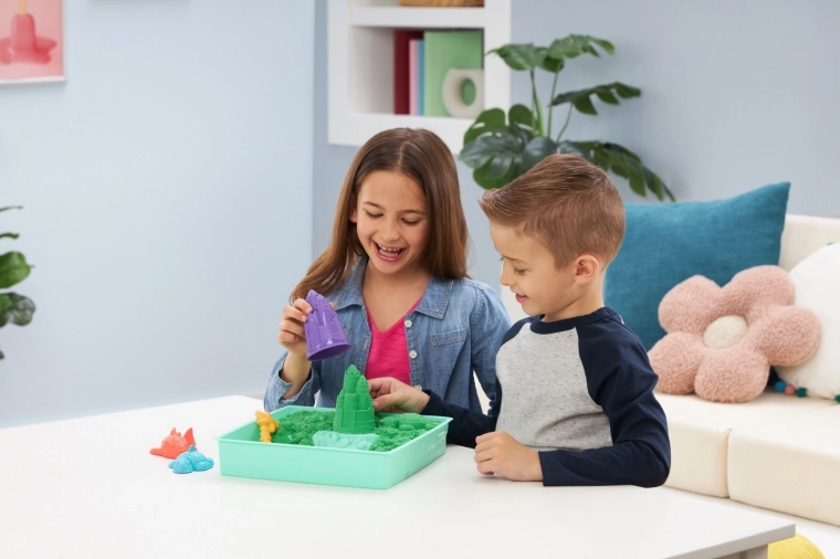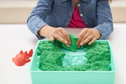 Uključuje 454 g zelenog pijeska, kalupiće za morske životinje i dvorac te lopaticu za kopanje, zahvaćanje i posipanje. Pijesak je napravljen od prirodnog pijeska i izvrsna je alternativa plastelinu – potiče finu motoriku, kreativnost i samostalnu igru.