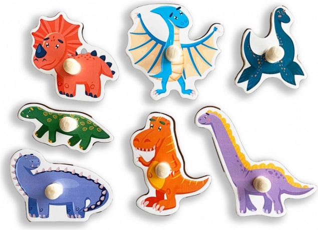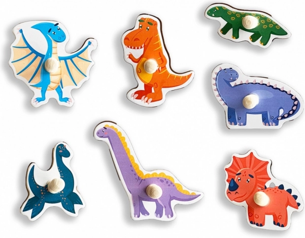 Šarena drvena slagalica s dinosaurima za najmlađe potiče finu motoriku, koordinaciju oko–ruka i prepoznavanje oblika i boja. Sedam dijelova s praktičnim ručkicama umeće se u precizno izrezane otvore na ploči, što olakšava rukovanje i razvija logičko razmišljanje i vizualno pamćenje.