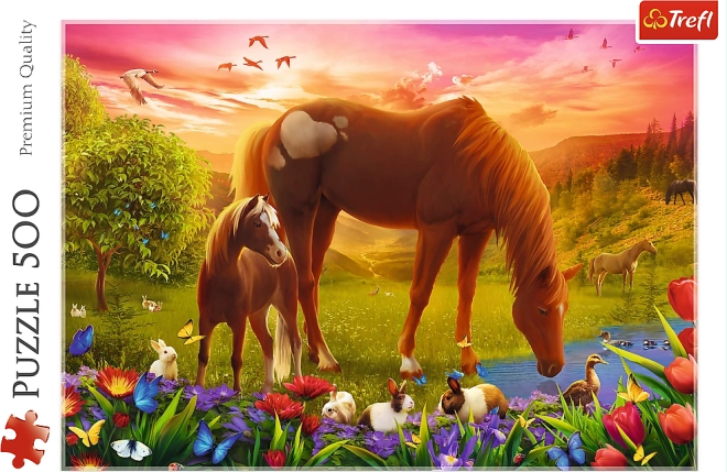 Slagalica 500 dijelova s motivom konja na livadi. Kvalitetna izrada, kalandrirani papir, dimenzije nakon slaganja 480 × 340 mm. Ekološka, proizvedena u Poljskoj.