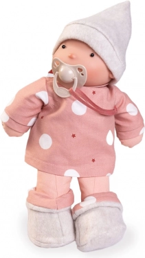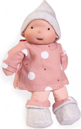 Ova nježna lutka posebno je dizajnirana za dojenčad i malu djecu. Kombinira ekološke materijale s sigurnom izradom: tijelo i udovi od organskog pamuka, realistična glavica od 100% silikona i ispuna od mekog recikliranog PET vlakna. U kompletu je magnetna duda od bio organskih materijala s prirodnim pigmentima.