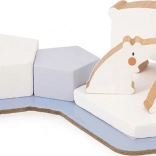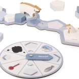 Igraći set uključuje različite drvene komponente i kartonsku ploču, izrađene s naglaskom na kvalitetu i izdržljivost. Naglašene boje i razigrani elementi osiguravaju da svaka igra bude nova avantura.