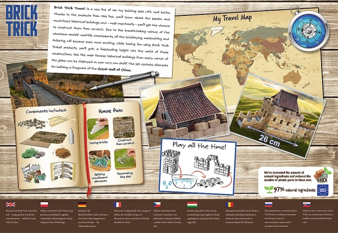 Otkrijte ljepotu i priču jedne od najpoznatijih svjetskih znamenitosti. Uz seriju Brick Trick Travel izgradit ćete Kineski zid od temelja i korak po korak stvoriti dojmljiv model od pravih glinenih ciglica i drvenih elemenata. Zahvaljujući priloženim ukrasima i naljepnicama postižete autentičan izgled.