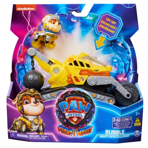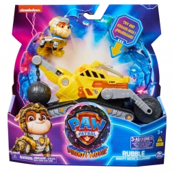 Doživite akcijske spasilačke misije s Rubbleom i njegovim građevinskim vozilom iz filma PAW PATROL: MOĆNI FILM. Robusno vozilo s prednjim valjkom, rušilačkom kuglom, bljeskajućim svjetlima i zvučnim efektima (baterije u pakiranju) idealno je za male obožavatelje. Postavljanjem figurice na sjedalo aktivira se osvjetljenje na više mjesta vozila, što svaku misiju čini još uzbudljivijom.