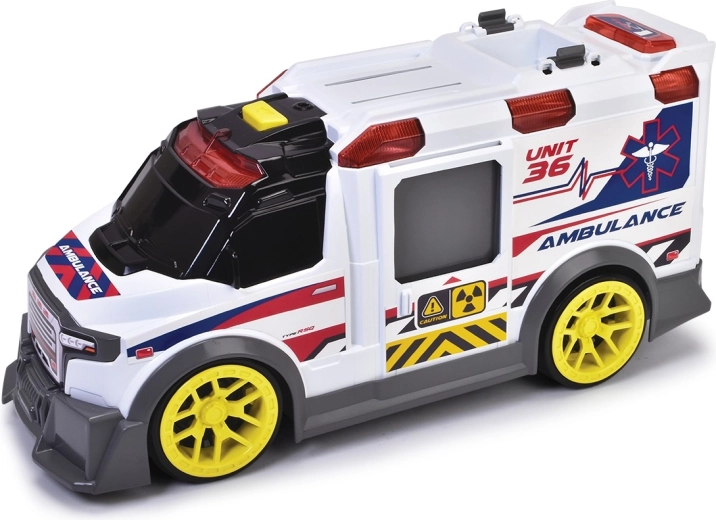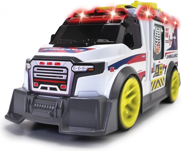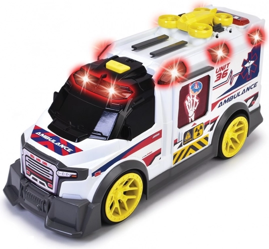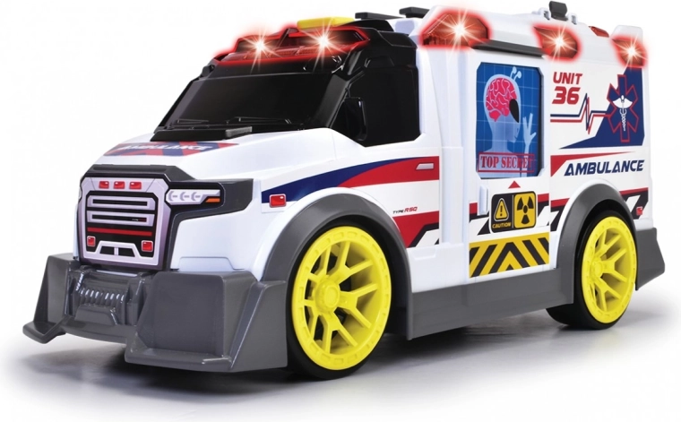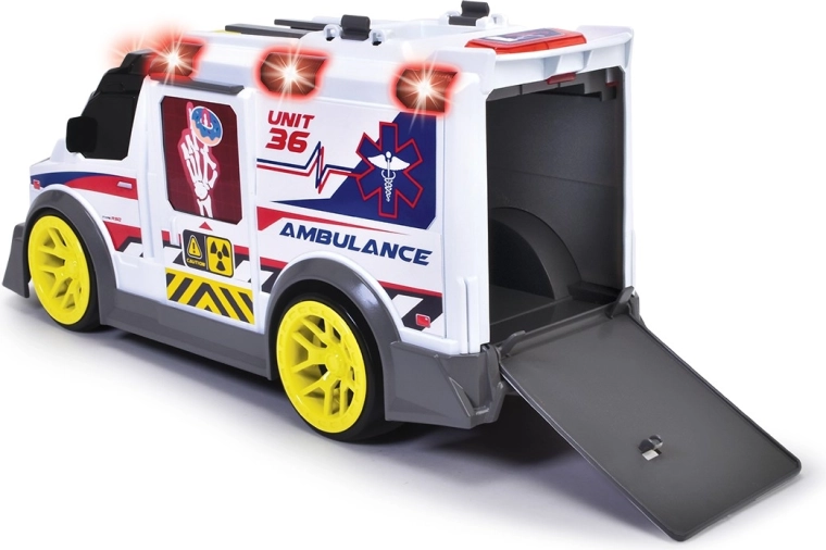 Ambulantno vozilo Ambulantno vozilo sa svjetlosnom i zvučnom funkcijom. Vozilo ima otvarajuće dijelove. Set sadrži rendgen, dron koji se može skinuti s krova, nosila i kutiju prve pomoći.