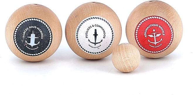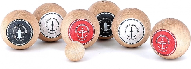 Stilizirani set za tradicionalnu igru pétanque u dizajnu inspiriranom francuskom mornaricom. Sadrži 6 kugli za igru, ciljnu kuglicu i praktičnu platnenu vrećicu. Izrađeno od masivnog lakiranog drva, ekološki i održivo. Idealno za 2–6 igrača, prikladno od 5 godina, proizvedeno u Francuskoj.