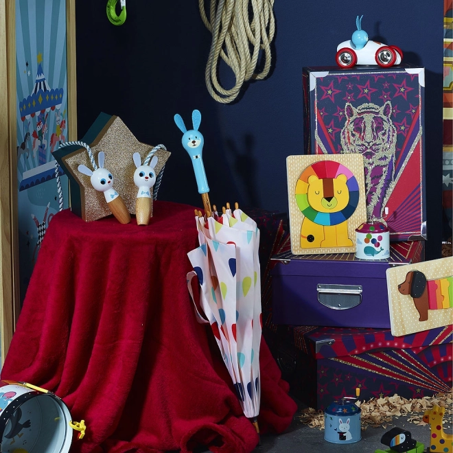 Presladak dječji kišobran s likom zeca Raoula brenda VILAC ima lakiranu drvenu dršku u obliku životinjice i čvrstu metalnu konstrukciju. Idealan je za kišne dane, dobro leži u dječjoj ruci i zahvaljujući kvalitetnoj izradi podnosi svakodnevnu upotrebu. Dio je kolekcije Boizoos – savršen poklon za najmlađe.