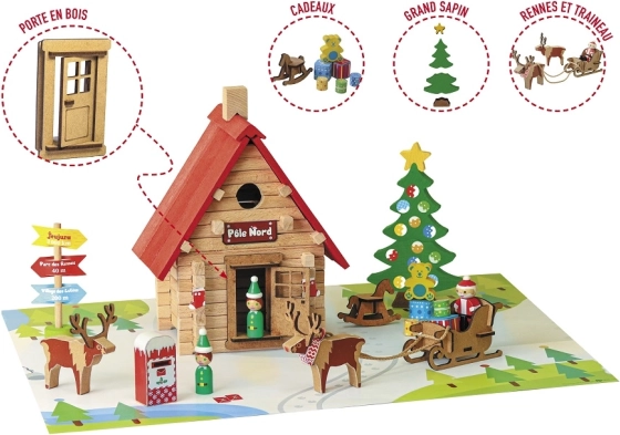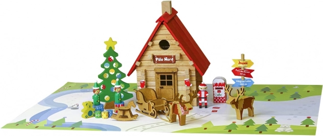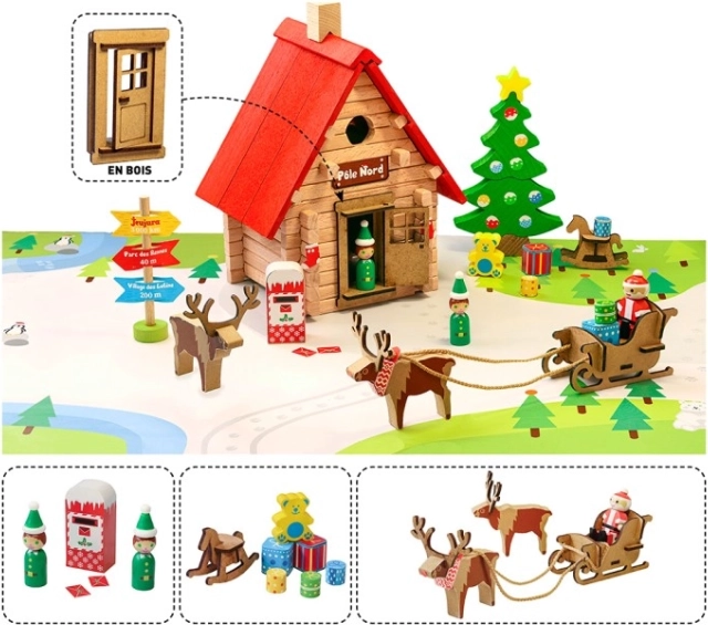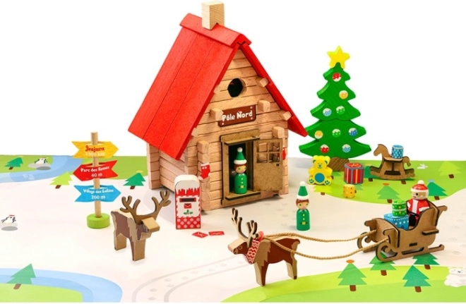 Ova tematska građevna igračka donosi djeci atmosferu Sjevernog pola izravno u sobu. Sagradite Djedovu kućicu, rasporedite figurice vilenjaka, upregnite jelene u saonice i ukrasite prostor božićnim borom s darovima. Zahvaljujući preciznim drvenim dijelovima, slaganje je zabavno te razvija finu motoriku, strpljenje i kreativnost.