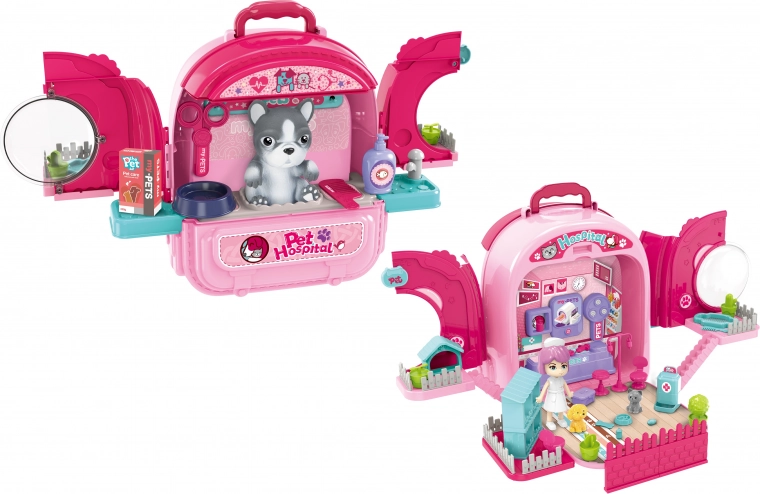 Prijenosna bolnica za životinje omogućuje djeci da njeguju svog omiljenog plišanog prijatelja bilo gdje. Razni dodaci pružaju realističan doživljaj.