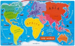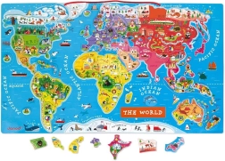 Ova prekrasna magnetska karta svijeta dimenzija je 77 x 46 x 1 cm i sadrži 92 drvena puzzle-dijela. Svaki dio predstavlja regiju ili zemlju, nosi naziv glavnog grada i uključuje ilustraciju koja karakterizira to mjesto, poput znamenitih građevina, spomenika, životinja i biljaka. Karta je na engleskom jeziku i može se objesiti na zid, čime postaje jedinstven ukras dječje sobe.