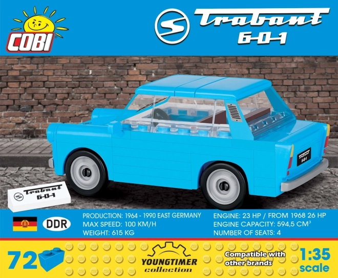 Trabant 601 jedan je od najpoznatijih automobila istočne Europe. COBI set u mjerilu 1:35 precizno prenosi njegove tipične linije te omogućuje manje dorade i modifikacije. Model odlično izgleda na polici, a ujedno nudi zabavno sastavljanje za djecu i odrasle.